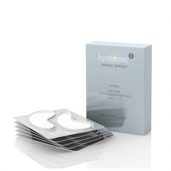Okamžitě vypínací oční polštářky s obsahem kyseliny hyaluronové a mořského kolagenu. Vždy, když vypadají Vaše oční partie unaveně a povoleně, darujte jim s pomocí hyaluronic3 X-Press očních polštářků novou pružnost a zářivě vyhlazený vzhled. Vrásky jsou okamžitě zjemněny a oční partie září mladistvou svěžestí. Oční polštářky jsou díky homogenní vrstvě s obsahem hyaluronu a kolagenu samodržící. To umožňuje maximální přijetí účinných látek a velmi příjemné používání.